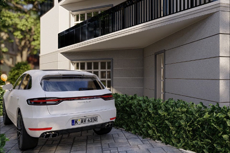- Fasade weiß verputzt mit besonderen Details wie Attika und Fensterfaschen
